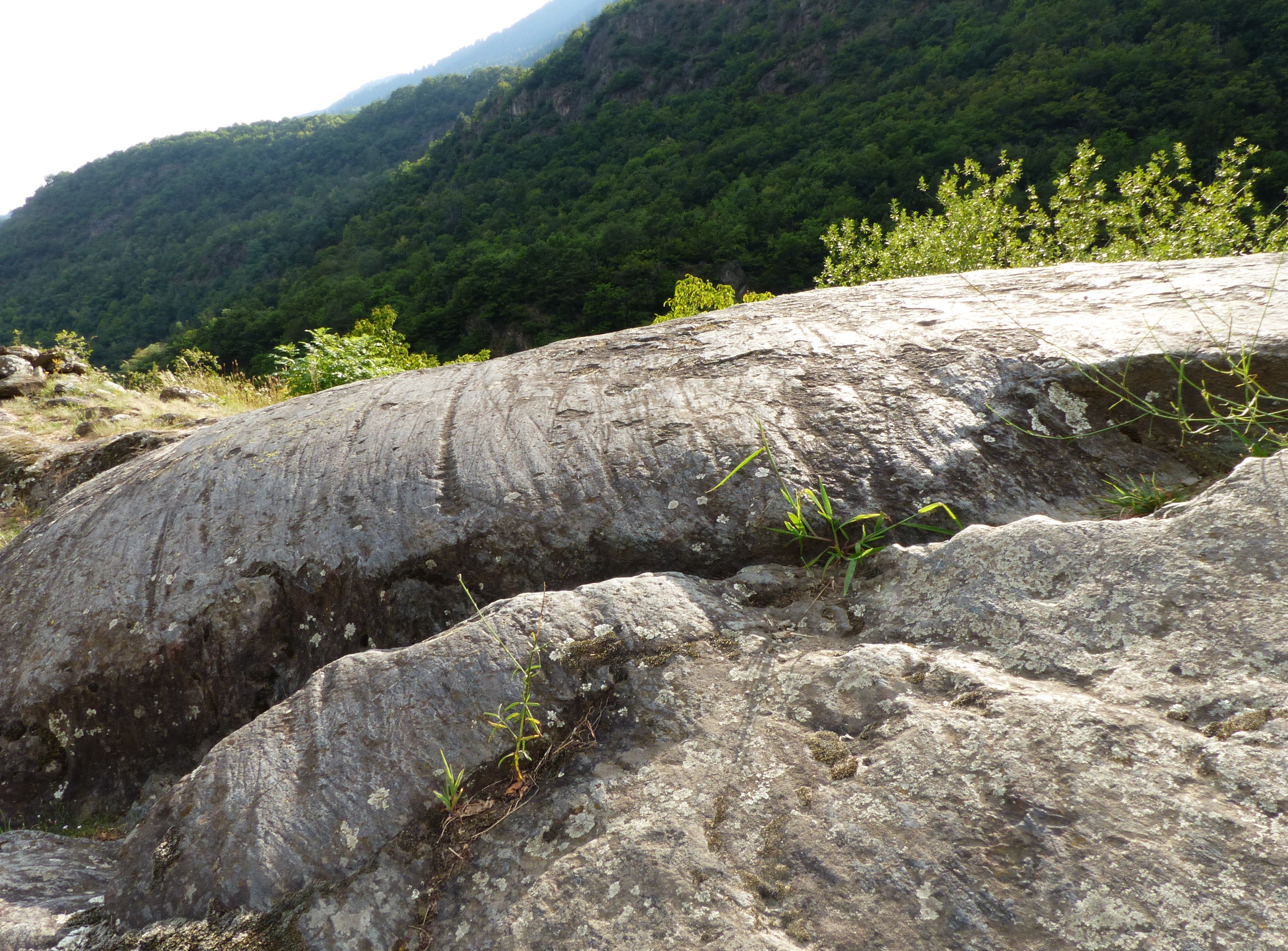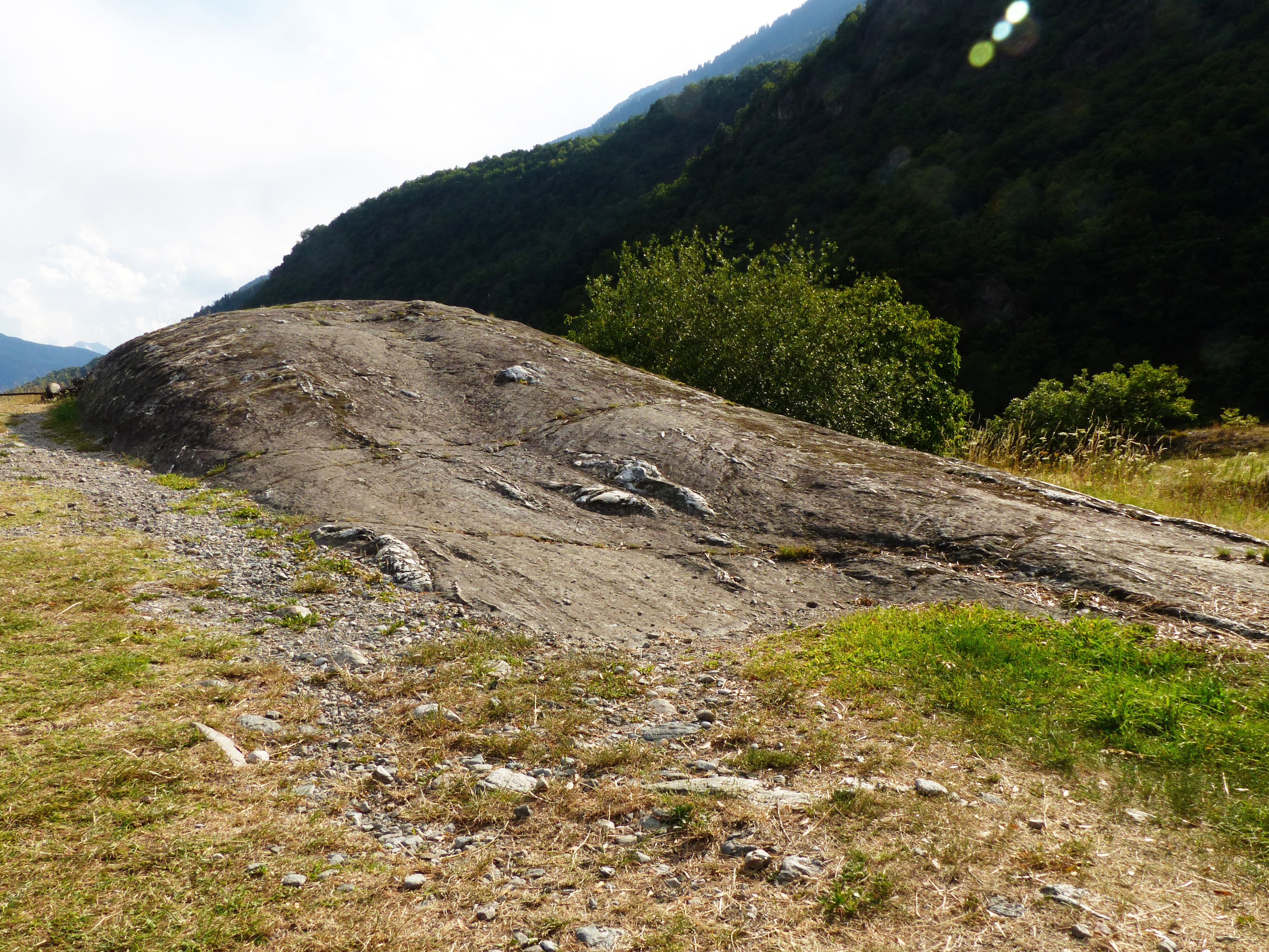 In the Grosio site the rock is of a phylladic nature, veined with white quartzite, and is generally covered by a blanket of thin and discontinuous soil; the maximum degree of denudation and glacier modeling is reached by the suggestive “rupe magna”, called "whale" in the past for its shape resembling a whale's back and for its large size. In fact, this large sheepback rock is 84 m long and 35 m high and is located in a dominant position which makes it visible even from the valley floor. The “rupe magna” was shaped by a glacier that flowed slowly but relentlessly over it, dragging huge quantities of debris and rocks at its base. Therefore, large boulders advanced under the enormous weight of the ice above, impressing numerous linear grooves on the rock surface, up to 1-2 centimeters wide and up to a few meters long, still visible today where the rock is free of debris and vegetation cover.