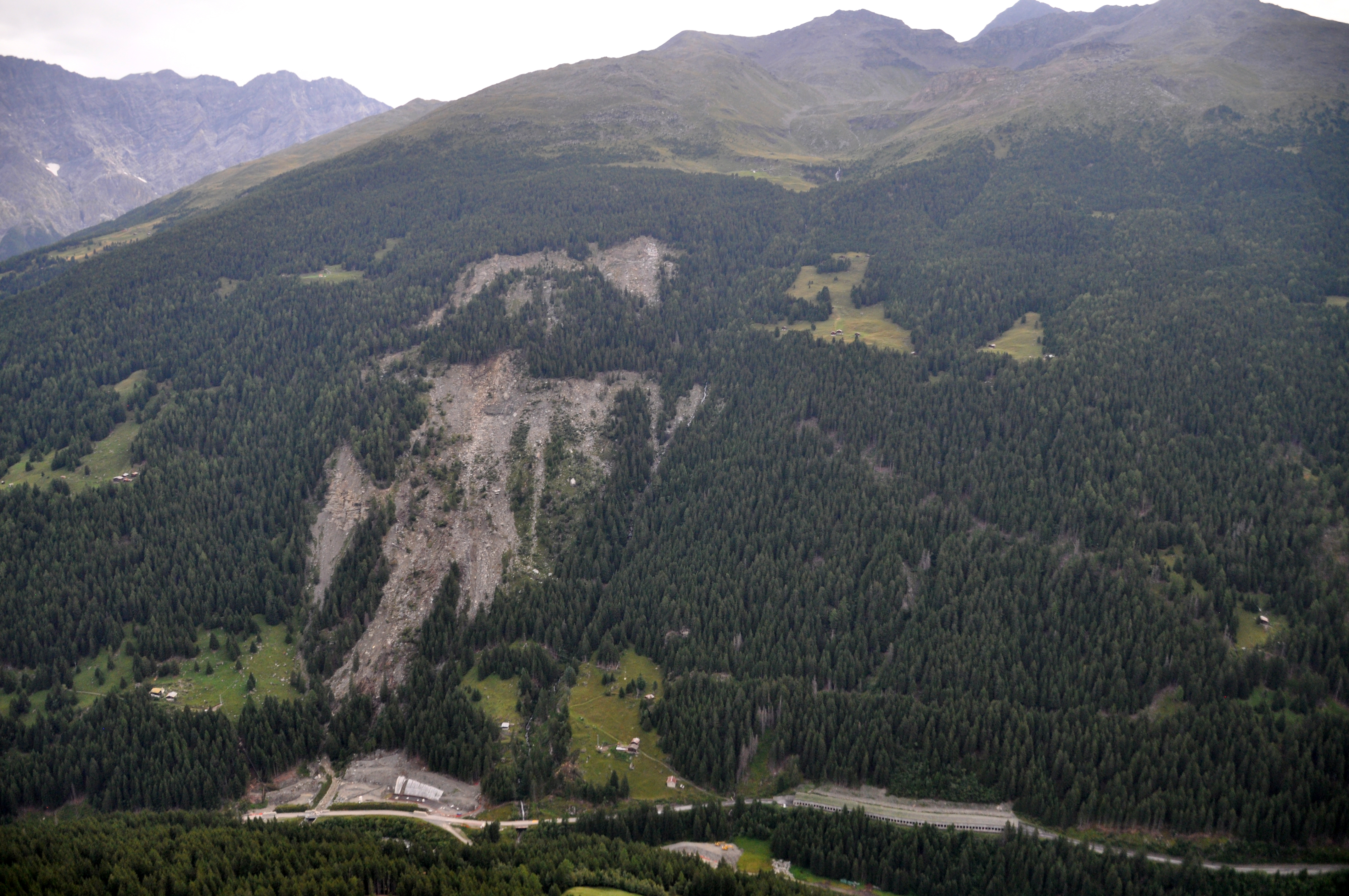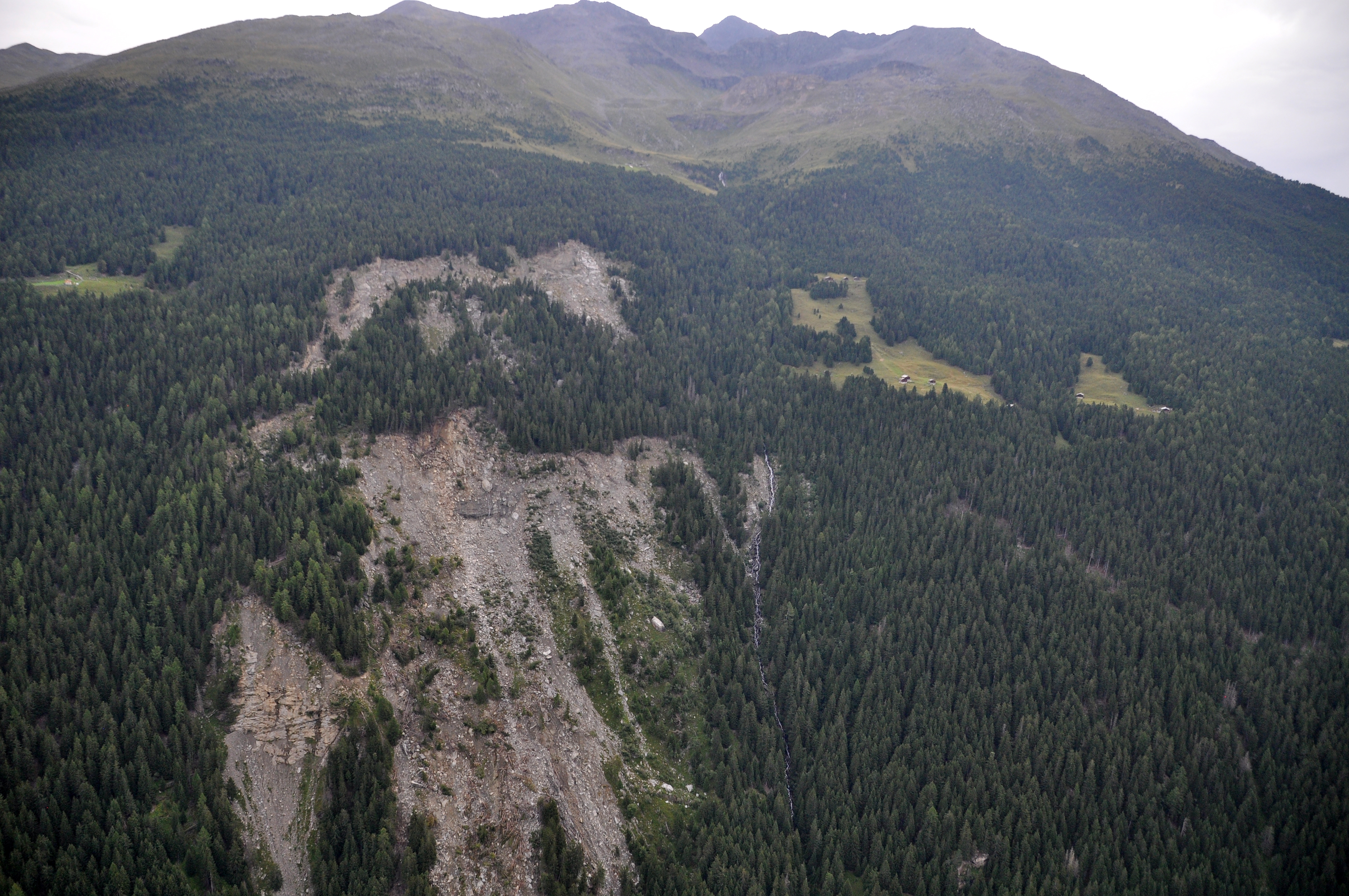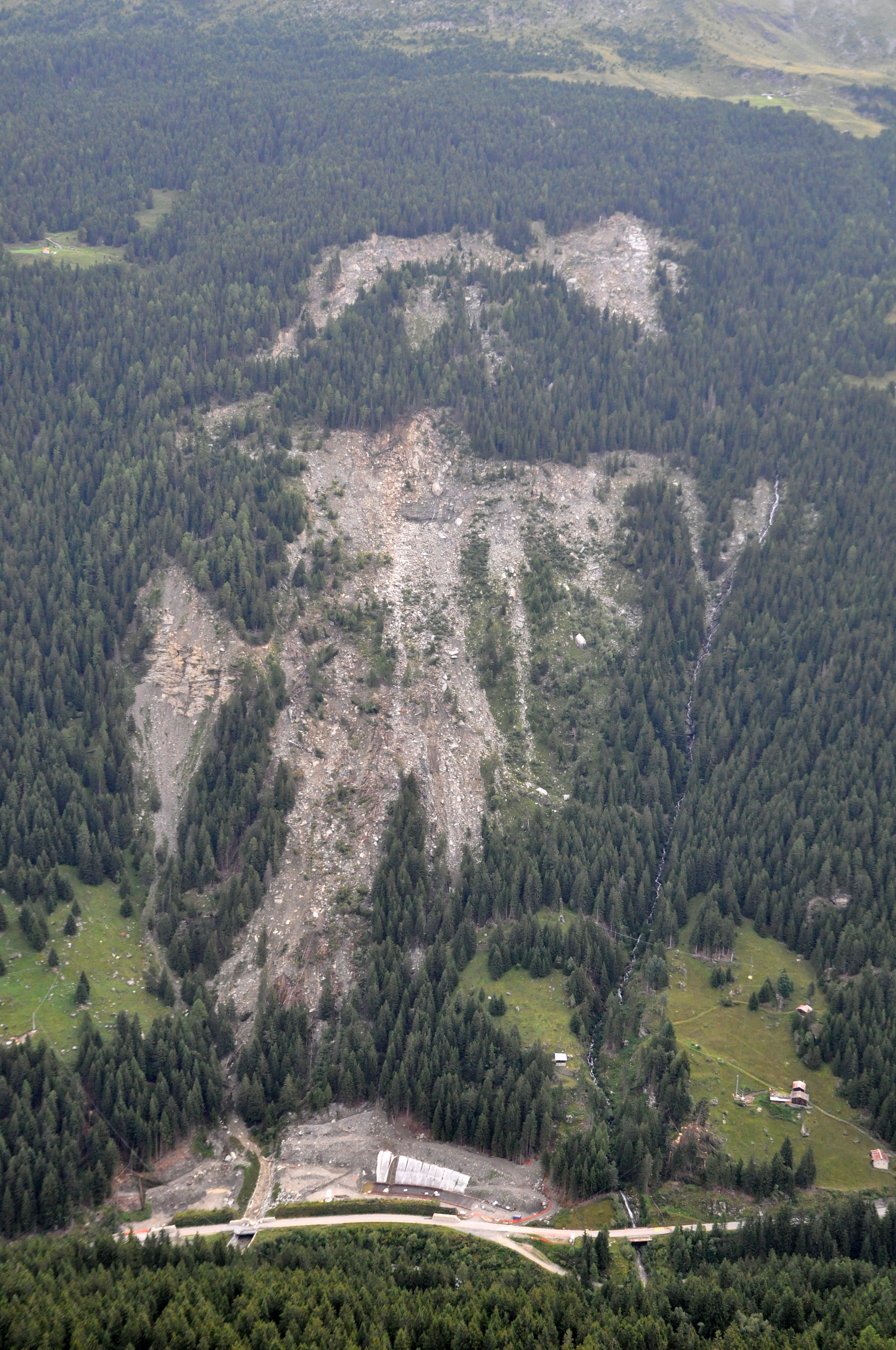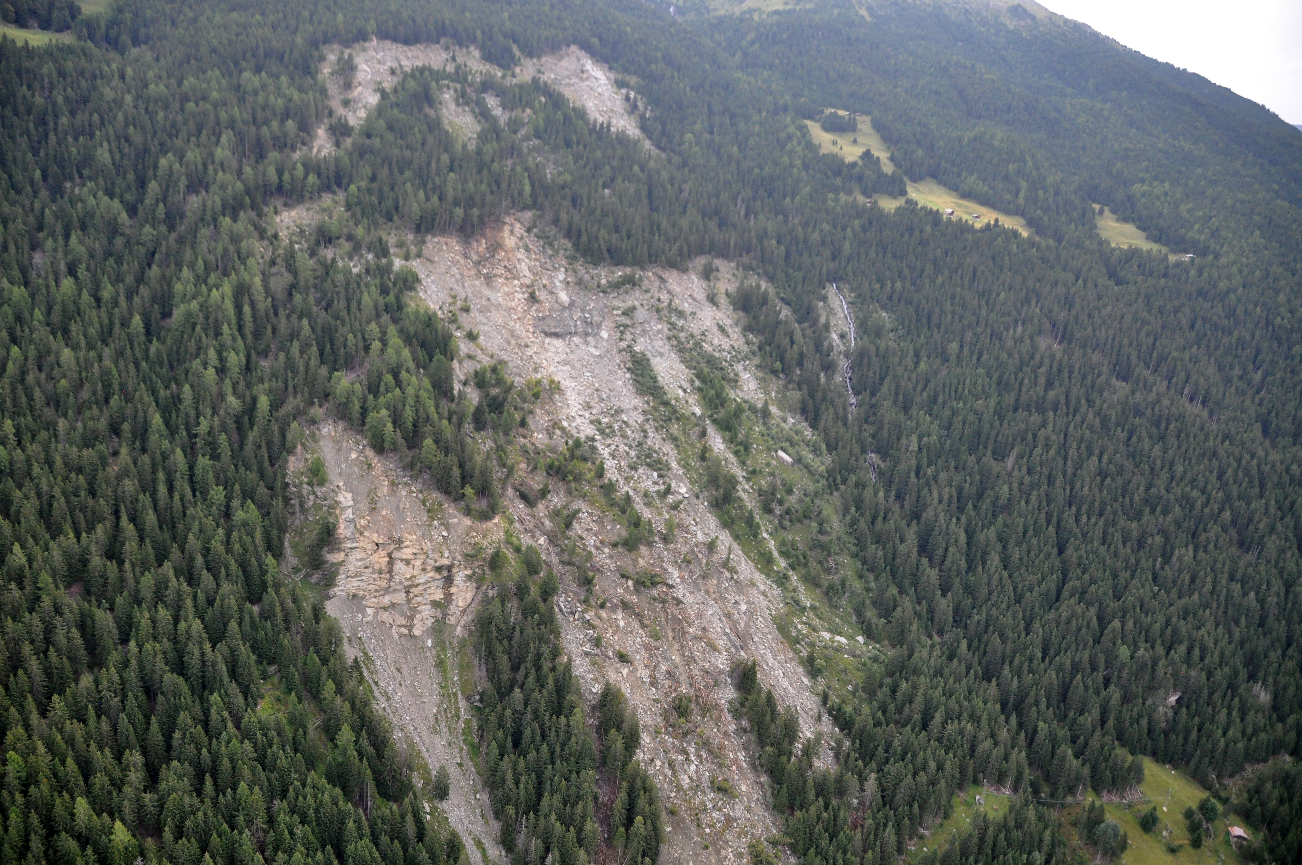 The Ruinon landslide appears today as a wide scar in the forest, at least 700 m wide and with two distinct niches, the higher one at about 2100 m a.s.l., and the lower one at 1900 m a.s.l. The whole landslide body has an estimated volume comparable with the one of Val Pola landslide.