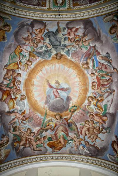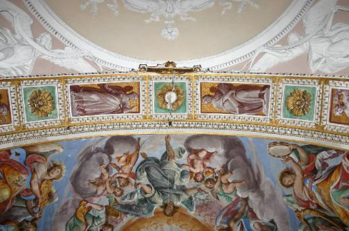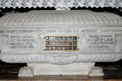 La chiesa dei Santi Gusmeo e Matteo, circondata da un parco di platani, si trova in posizione elevata rispetto all'abitato lungo una strada parallela al tracciato della via Regina che conduce al Convento di Santa Maria delle Grazie. La località, secondo la tradizione, coincide con il luogo dove avvenne il martirio dei due santi e dove esisteva una chiesa dedicata a San Fedele. L'edificio è preceduto da un pronao realizzato nel XVIII secolo e presenta una semplice facciata a capanna. Sul fianco meridionale e nella parte absidale è possibile osservare strutture ed elementi, le monofore in cotto, gli archetti e la cornice con dentelli in cotto, appartenenti all'antica chiesa romanica a pianta centrale, edificata probabilmente nel XIII secolo, e sostanzialmente ricostruita a partire dal 1533 quando venne invertito l'orientamento. L'interno della chiesa a navata unica con cappelle laterali è completato da un'abside a pianta quadrata. Sul fianco sinistro la prima cappella, dedicata alla Vergine del Rosario, conserva una statua policroma, una tela risalente al XVII secolo e alcuni affreschi settecenteschi, entro cornici in stucco, attribuiti a Giovanni Battista Pozzi. Sul lato destro il primo altare è dedicato alla Vergine del Rosario e conserva uno stendardo in seta e una tela del XVII secolo. La nicchia prima del presbiterio presenta una decorazione plastica realizzata in stucco policromo con la statua di S. Pio V, eseguita nel XVIII secolo dopo l'avvenuta beatificazione di papa Ghisleri, e sui lati statue degli evangelisti. Sul lato sinistro la cappella della Ss. Annunciata, fabbricata nel XVII secolo, conserva una statua della Vergine col Bambino, una tela con l'Annunciazione e affreschi settecenteschi con scene della Vita della Vergine inquadrati da cornici in stucco. Il ciclo decorativo più interessante all'interno della chiesa è costituito dalla decorazione sulla volta del presbiterio, realizzata e firmata nel 1608 da Giovan Mauro Della Rovere, detto il Fiammenghino, che raffigura la Gloria di Dio Padre fra Angeli musicanti. La volta presenta inoltre una decorazione a stucco realizzata da Giovanni Battista da Moltrasio fra il 1632 ed il 1633. L'altare realizzato in marmi policromi ospita il reliquario in cui si conservano le reliquie dei santi traslate nel 1637, per volontà del Vescovo Carafino. Sul lato nord della chiesa si trova il campanile a torre, eretto nel XVII secolo, che presenta decorazioni ad archetti sulle cornici marcapiano.
