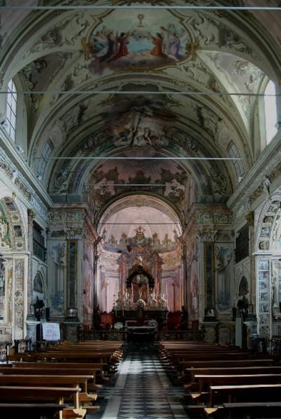 L'interno della chiesa, a navata unica con cappelle laterali, è particolarmente ricco e presenta lungo la volta e le pareti una scenografica decorazione pittorica, composta da elementi architettonici, quadrature e ornati floreali, realizzata da Felice Biella nel XVIII secolo. Sul lato destro la prima cappella, dedicata al Rosario, accoglie sull'altare una statua della Madonna col Bambino e consente l'accesso ad un piccolo vano dove si conservano lacerti di un affresco del XV secolo raffigurante la Trinità e S. Pietro Martire.