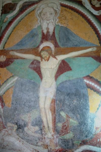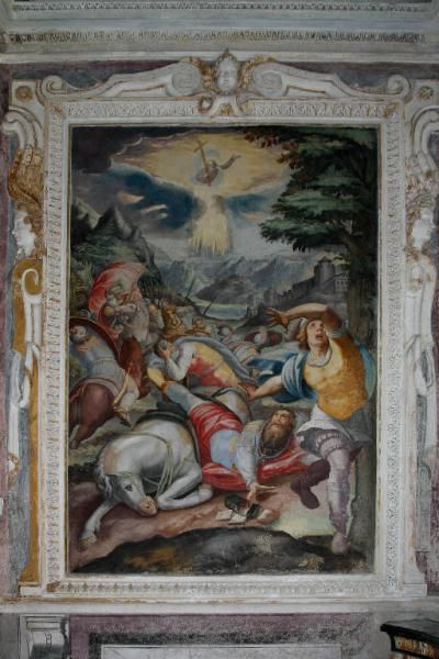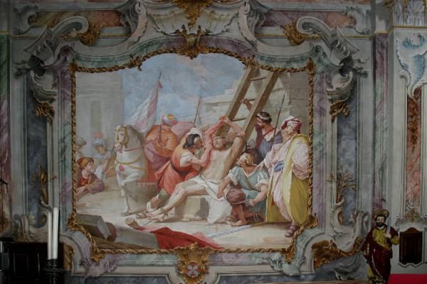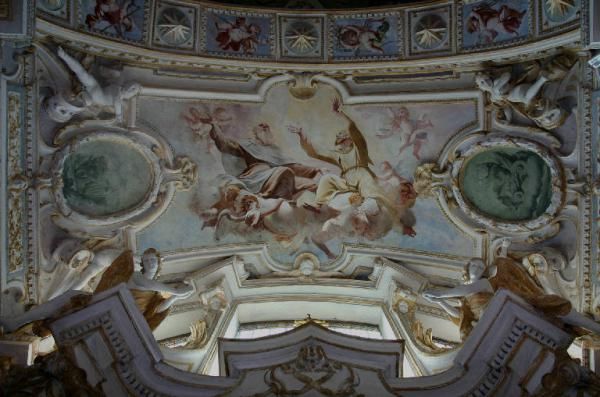 Sulla volta invece una decorazione illusionistica di gusto rococò disegna una finta cupola sormontata da una lanterna rappresentata di scorcio in modo che sia visibile dalla navata. Sopra l'altare settecentesco in marmi policromi si conserva un crocifisso ligneo policromo, risalente alla fine del XV secolo. La terza cappella sul lato sinistro, dedicata ai SS. Pietro e Paolo, ospita un altro ciclo pittorico di grande interesse, che raffigura le Storie dei due santi, eseguito da Domenico Caresana nel 1605.