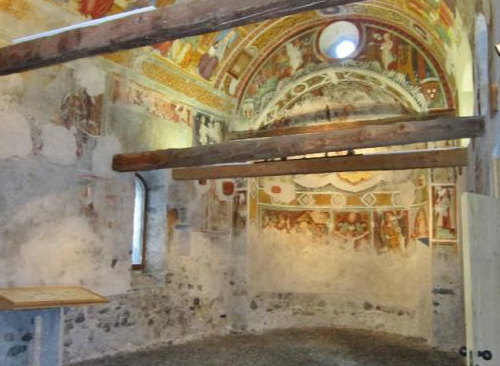 L'interno è rivestito da vivaci pitture rinascimentali che con insistenza tornano sul tema della Trinità. Gli affreschi sulle pareti dell'aula sono di natura votiva; alcuni vengono riferiti al pittore locale Luigi Sermondi e datati intorno al 1475, mentre i modi colti e aggiornati del milanese Bartolino de Buri sono stati riconosciuti nei due personaggi (un uomo e una donna) vestiti con abiti sontuosi e di foggia modaiola, in linea con le tendenze del Quattrocento inoltrato.