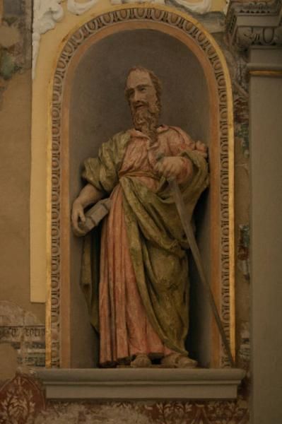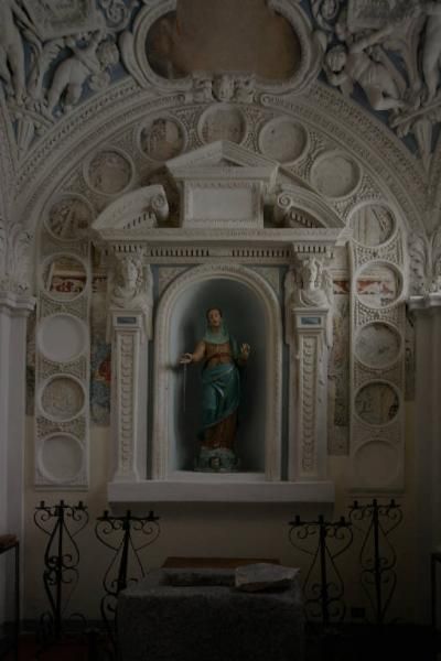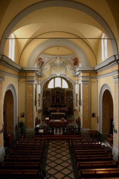 L'interno, a navata unica con cappelle laterali, è il risultato della trasformazione settecentesca della primitiva chiesa romanica a tre navate con absidi quadrangolari. Sul lato destro nella prima cappella, che ospita il battistero, si trova un affresco del Battesimo di Cristo, eseguito da Luigi Tagliaferri nel XIX secolo, e sulla parete si conservano lacerti di affreschi più antichi. La cappella successiva, dedicata al Sacro Cuore, presenta un altare in marmi policromi sul quale è collocata una statua in gesso dipinto. A lato dell'altare si conserva una statua lignea policroma di S. Rocco che risale al XVI secolo. Sul lato destro del presbiterio si apre la cappella del Rosario che conserva una decorazione a stucco e un ciclo di affreschi del XVII secolo con l'Assunzione e Storie della Vergine sotto i quali sono visibili tracce di decorazioni più antiche. Sulla parete del vano che precede la cappella è possibile osservare una porzione di affresco quattrocentesco con le figure di S. Nicola da Tolentino e S. Caterina di Alessandria. Il presbiterio è caratterizzato dalle balaustre e dall'altare settecentesco in marmi policromi su cui è collocato un pregevole trittico cinquecentesco che raffigura la Madonna che allatta il Bambino fra S. Stefano e S. Vincenzo. La volta del presbiterio conserva una decorazione in stucco e nei quattro pennacchi le figure dei quattro Evangelisti affrescate nel XIX secolo. L'abside a pianta quadrata è arricchita da decorazioni a stucco seicentesche che comprendono le statue di S. Pietro e S. Paolo inserite in due nicchie e figure di angeli ed elementi floreali sulla volta. Al centro della parete di fondo è possibile ammirare una porzione di un interessante affresco della Crocifissione, risalente al XV secolo, portato alla luce nel corso di un intervento di restauro e ampiamente mutilato a seguito dell'apertura di una finestra termale nella parte superiore della parete. Sul lato sinistro del presbiterio si trova la sacrestia, un tempo cappella dedicata a S. Marta, che conserva una decorazione a stucco e parte della decorazione pittorica, risalente al XVII secolo, parzialmente danneggiata da un incendio. Lungo la navata la seconda cappella sinistra ospita un Crocifisso ligneo mentre la prima cappella, dedicata all'Immacolata Concezione, è arricchita da un altare in marmi policromi, realizzato nel 1795, da una statua in legno della Beata Vergine Immacolata del secolo XVIII e da una statua cinquecentesca di S. Stefano Protomartire.
