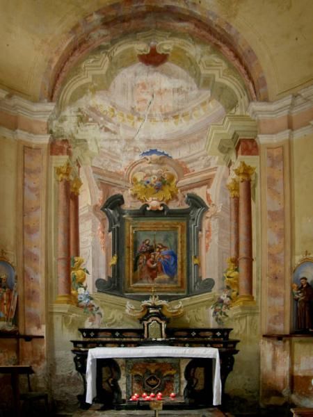 La chiesa, con annessa piccola sacrestia sul lato ovest, si sviluppa con pianta poligonale all'esterno e mistilinea all'interno. Le strutture murarie sono in pietra, mattoni e ciottoli legati da abbondante malta di calce; le coperture sono a tetto con struttura lignea e manto in lastre di pietra.