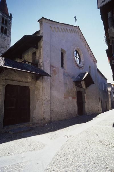 Lo stesso motivo cordonato ritorna nel portale con architrave e lunetta sormontati da una copertura in pietra a spioventi. Negli spazi al di sotto delle finestre si intravedono ancora tracce di affreschi cinquecenteschi. L'interno ad aula unica è dilatato in larghezza, chiuso dal presbiterio voltato a crociera e dal catino absidale. La copertura è a capriate. Lungo la controfacciata corre ancora il ballatoio ligneo risalente alla seconda metà del XV secolo. Di poco precedente è l'acquasantiera in pietra che mescola elementi romanico-gotici, come il tralcio vegetale e i pesci, alla baccellatura rinascimentale. Imponente e pregevole è l'impianto pittorico e decorativo della chiesa che, con affreschi, statue lignee e stucchi, si sviluppa per un arco cronologico che va dal XV al XVII secolo.