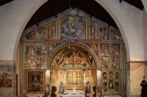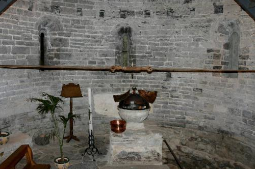 La struttura di copertura è costituita da travatura lignea con assito e manto in lastre di pietra.