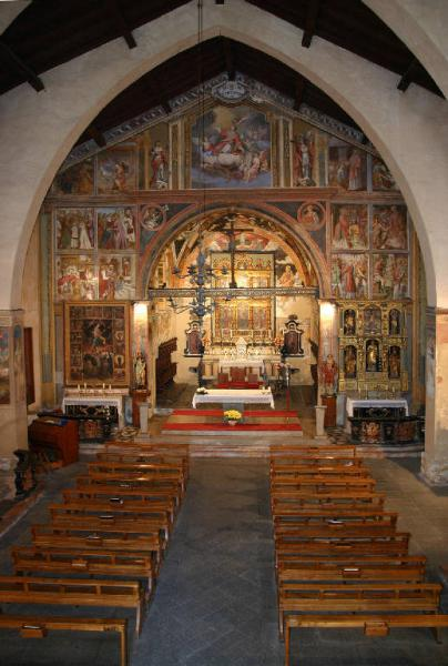 La chiesa si sviluppa con pianta ad unica navata con archi trasversali, cappelle laterali e profondo presbiterio rettangolare; a destra della navata, sotto la casa parrocchiale, si apre il vano dell'abside romanica, rinvenuta durante campagne di scavo archeologico, che conserva i resti di un pavimento musivo romano; poco più avanti, sullo stesso lato, si accede ad un locale adibito a deposito con accesso anche dall'esterno; a sinistra del presbiterio vi è la sacrestia; a destra un locale con funzione di deposito originariamente anch'esso con funzione di sacrestia.