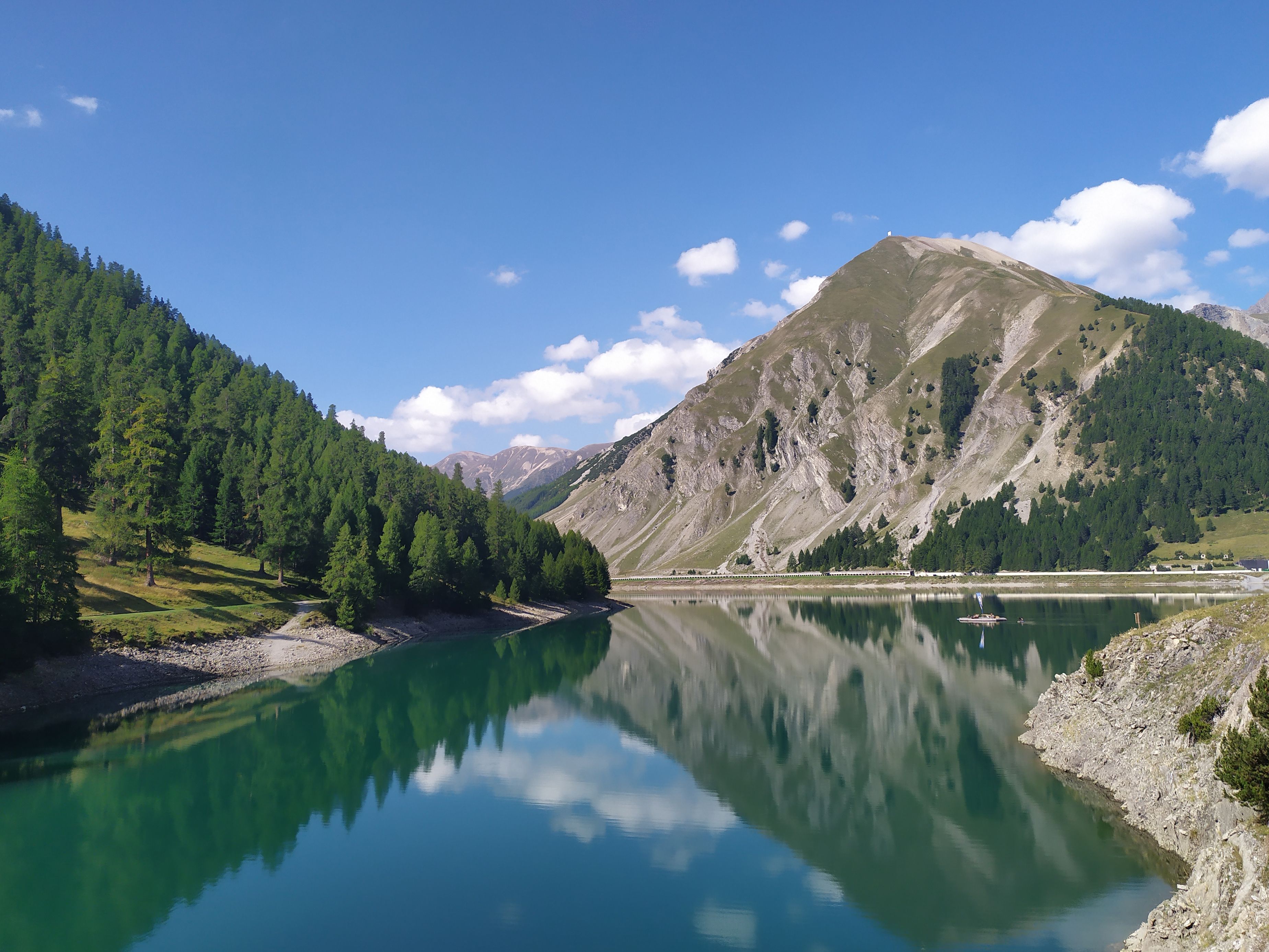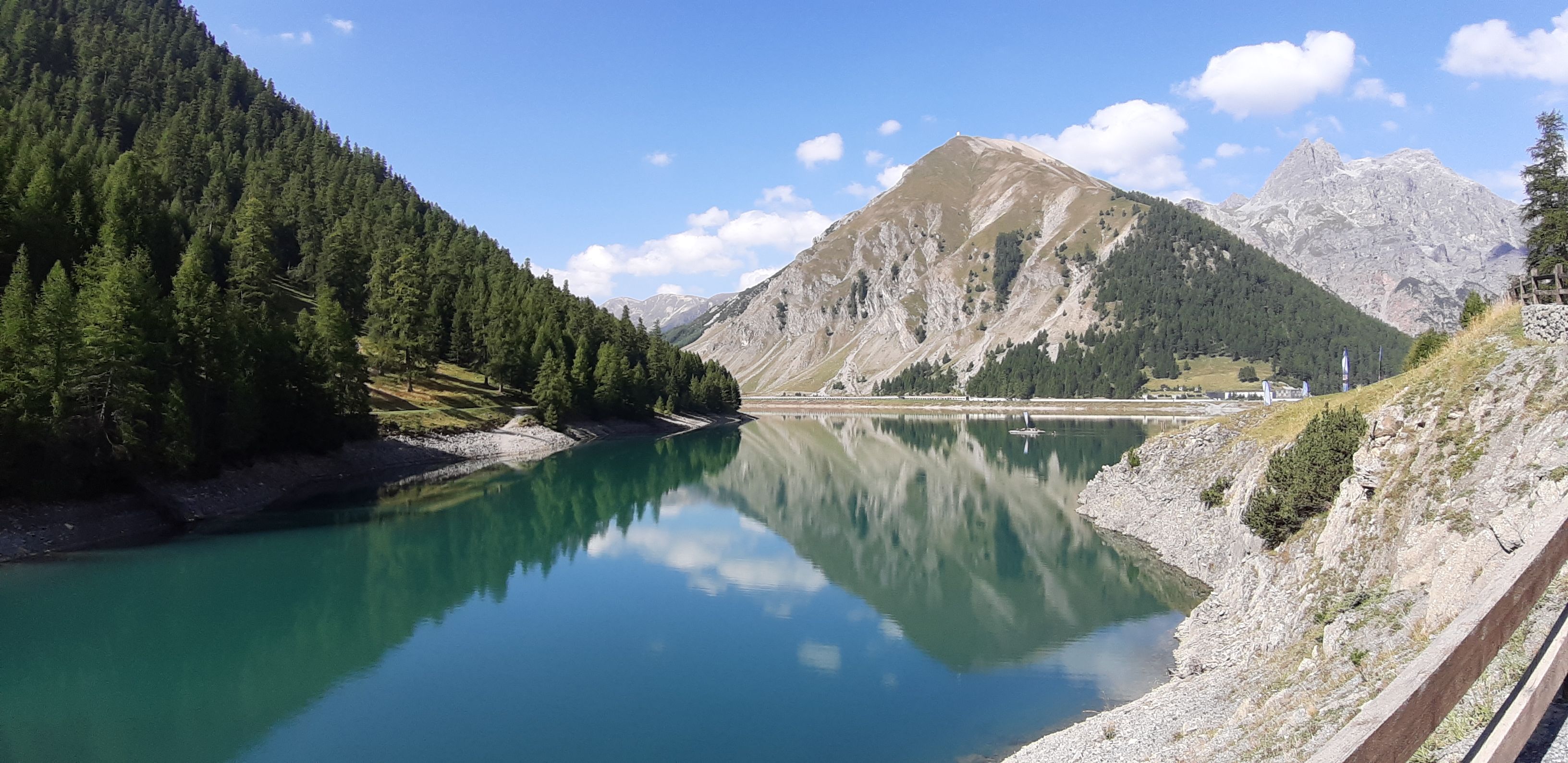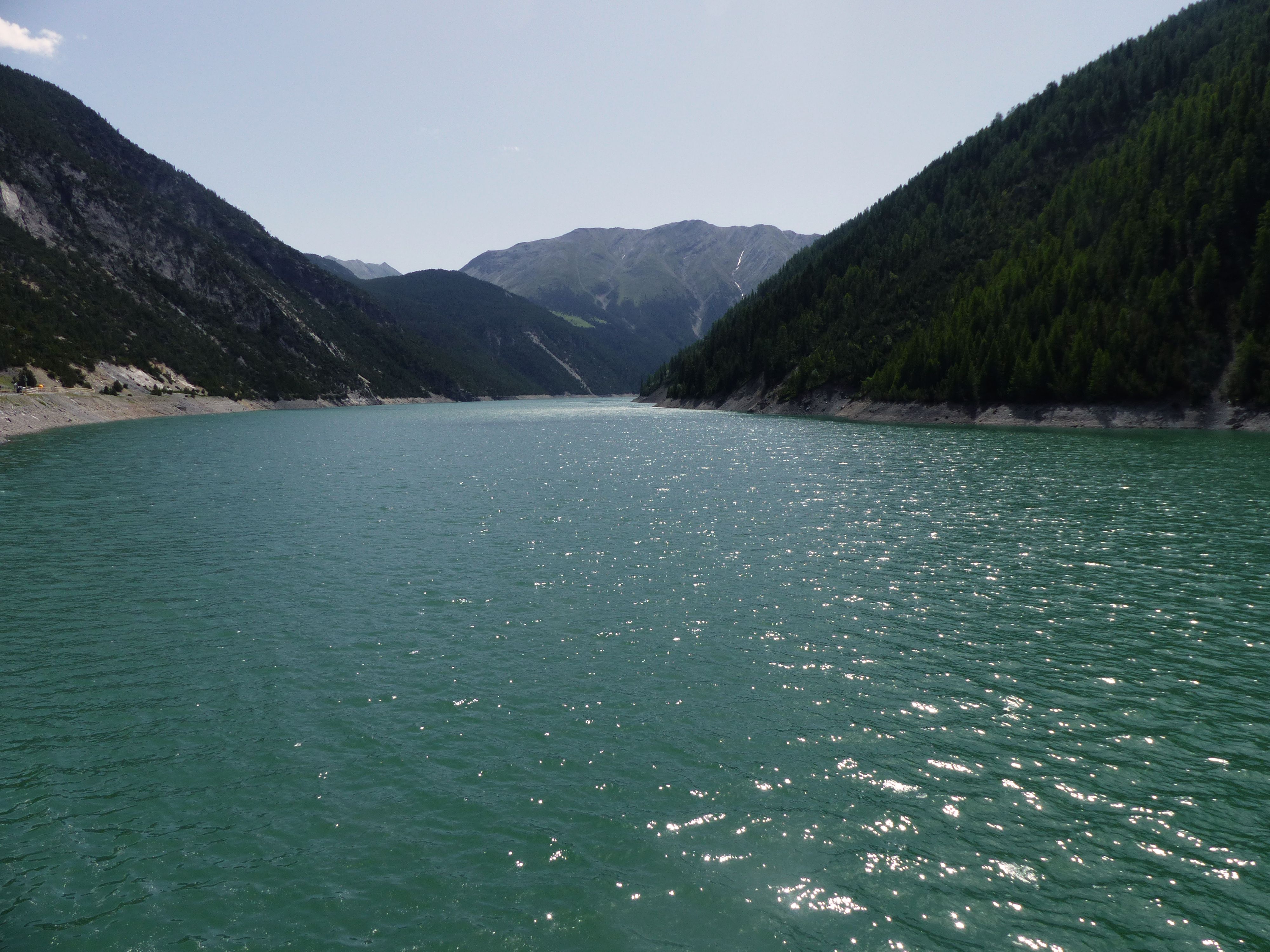 Ma l'elemento più strano è che la diga è attraversata dal confine italo-svizzero, e che le condotte forzate derivano la sua acqua alla centrale di Ova Spin, in Engadina; nonostante ciò, il lago si sviluppa tutto in territorio italiano, avendo persino sommerso l'antico villaggio di Viera, appena fuori Livigno, con la sua chiesina. Lunghe trattative sono state quindi necessarie fra i due stati, prima che, nel 1957, la Società elettrica svizzera Engadiner KrafterWerke ottenesse l'autorizzazione a costruire la diga, concedendo in cambio all'Italia il permesso di derivare dal bacino dello Spöl 90 milioni di metri cubi di acqua all'anno; essa viene trasferita, attraverso un canale sotterraneo, al bacino artificiale di San Giacomo, nella limitrofa valle di Fraèle. In tal modo, le acque della valle di Livigno alimentano ben due distinti sistemi idroelettrici, appartenenti a due diversi stati. Raggiunta in auto la diga, si possono percorrere a piedi i 540 m di lunghezza del suo coronamento, apprezzando l'imponenza della struttura e osservando le opere di scarico visibili presso la spalla destra e al piede del paramento di valle; oppure superarla in auto per raggiungere Zernez, in Engadina, immettendosi nel tunnel a pedaggio di Munt la Schiera, lo stretto cunicolo in roccia, oggi a senso unico alternato, costruito dalle EKW come galleria di servizio ai tempi dell'edificazine dello sbarramento. Se si ritorna invece verso Livigno, vale la pena fermarsi negli spiazzi panoramici fuori dalle gallerie paramassi e allo sbocco della Val Trenzeira, per ammirare gli spettacolari coni detritici che dai ripidi valloni del Cassa del Ferro scendono direttamente nel lago; si tratta di elementi estremamente attivi, spesso solcati da canaloni lungo i quali scendono nuove colate di fango e detriti, ben distinguibili perchè non colonizzate da vegetazione. Un'analoga falda detritica mobile, con minore estensione verticale ma con notevole continuità laterale, contorna anche la sponda sinistra, imponendo alla viabilità un percorso in gran parte protetto da apposite strutture.