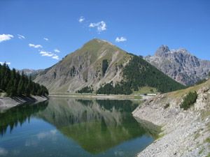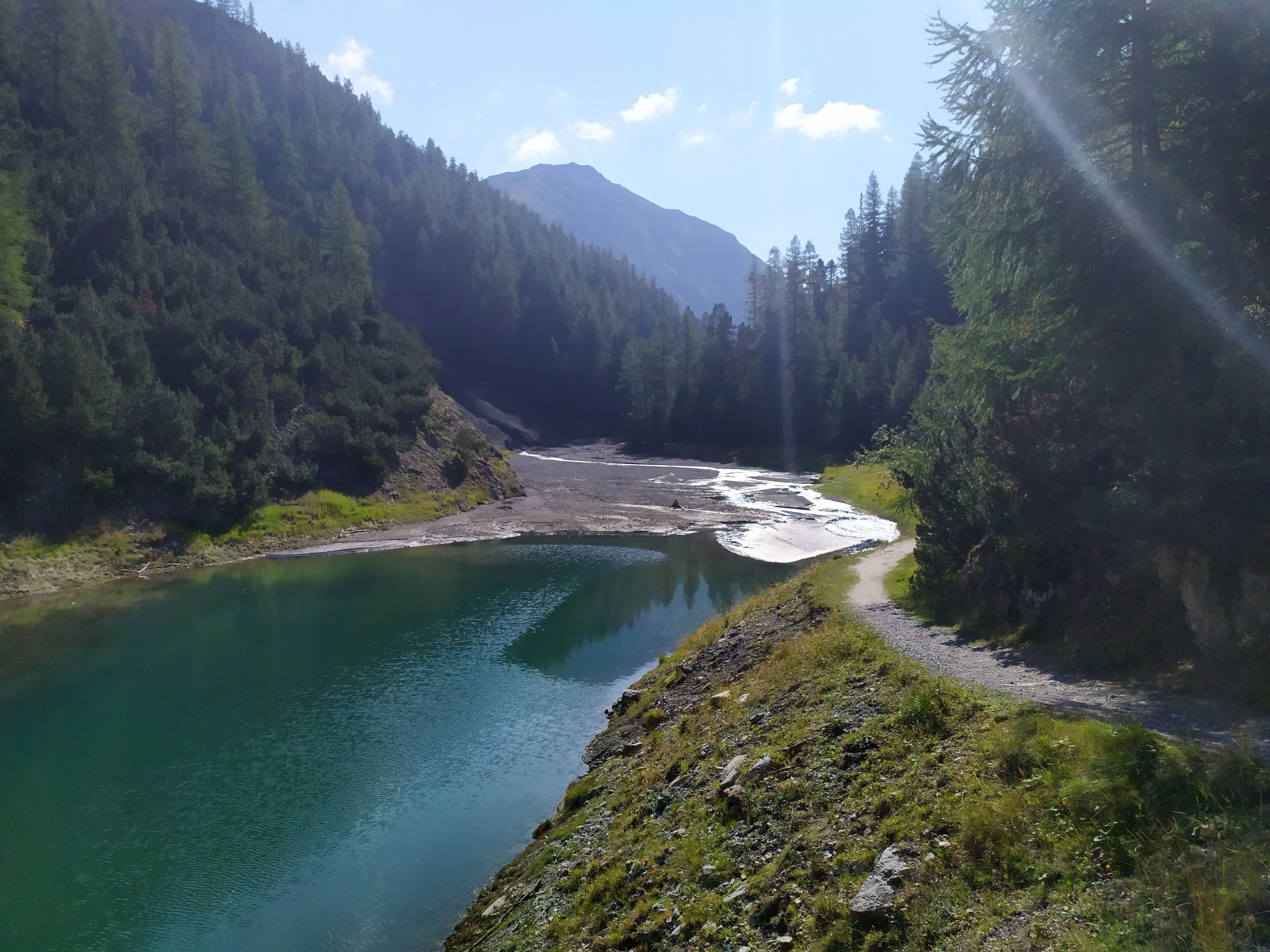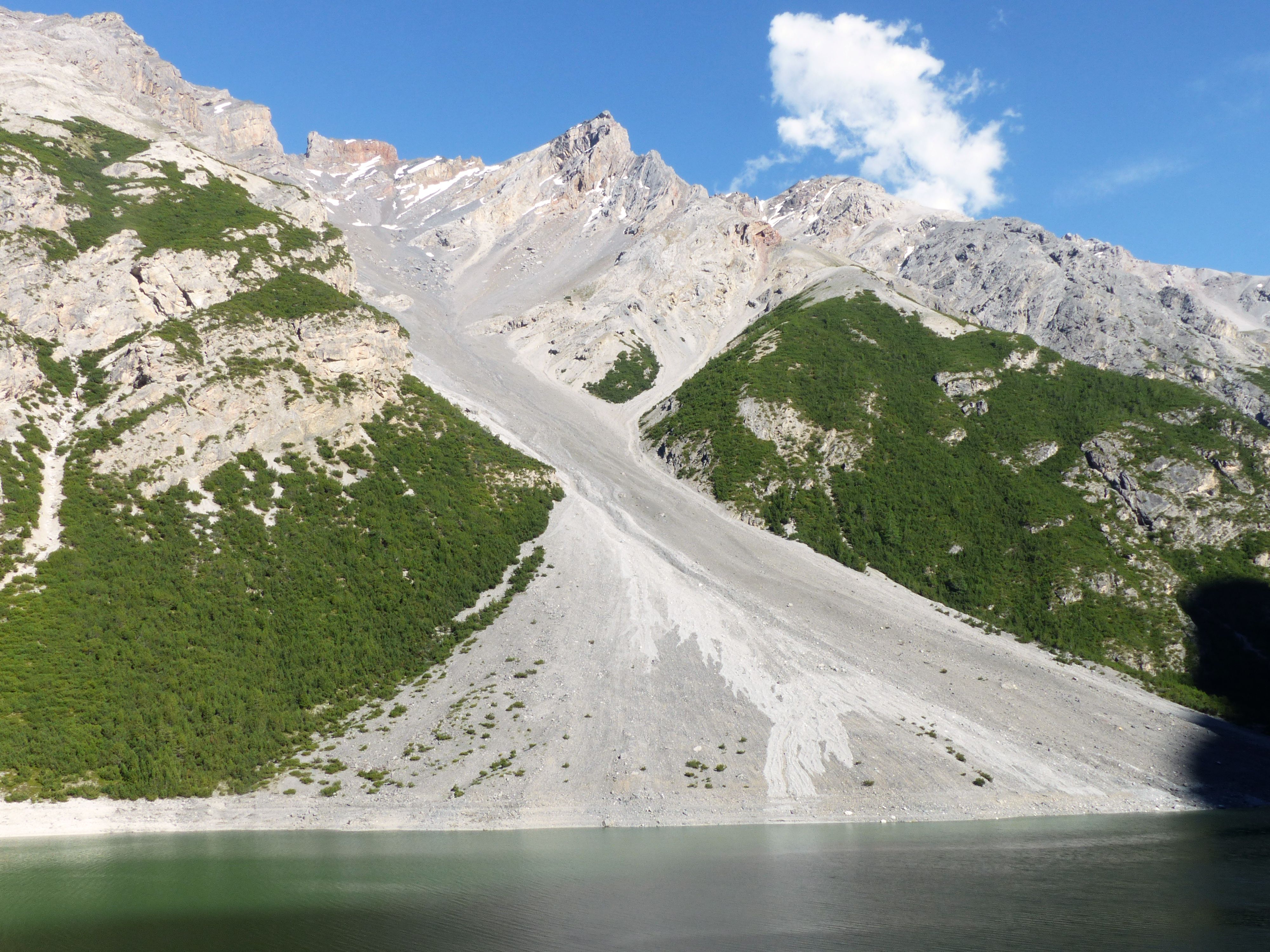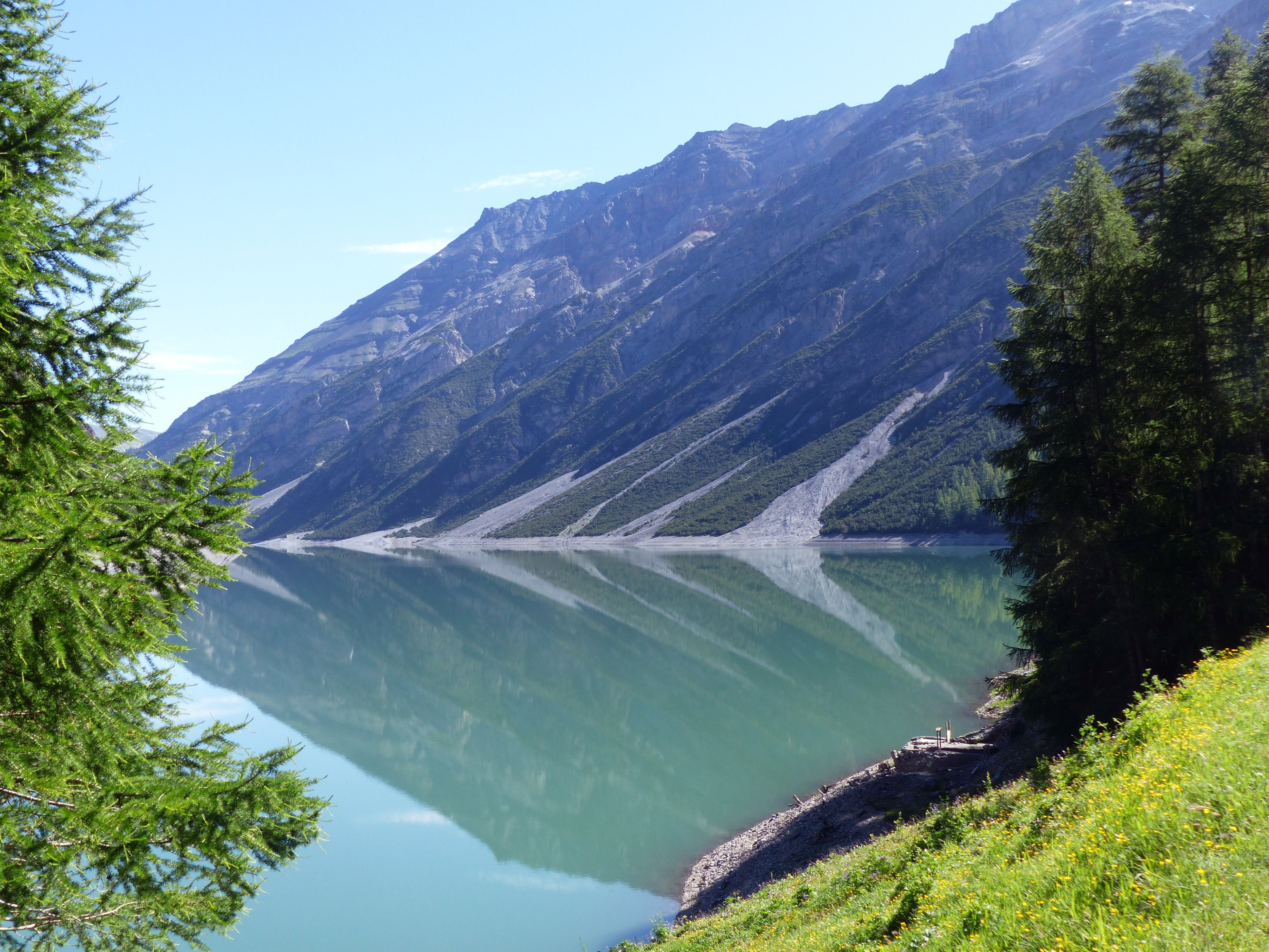 Ma l'elemento più strano è che la diga è attraversata dal confine italo-svizzero, e che le condotte forzate derivano la sua acqua alla centrale di Ova Spin, in Engadina; nonostante ciò, il lago si sviluppa tutto in territorio italiano, avendo persino sommerso l'antico villaggio di Viera, appena fuori Livigno, con la sua chiesina. Lunghe trattative sono state quindi necessarie fra i due stati, prima che, nel 1957, la Società elettrica svizzera Engadiner KrafterWerke ottenesse l'autorizzazione a costruire la diga, concedendo in cambio all'Italia il permesso di derivare dal bacino dello Spöl 90 milioni di metri cubi di acqua all'anno; essa viene trasferita, attraverso un canale sotterraneo, al bacino artificiale di San Giacomo, nella limitrofa valle di Fraèle. In tal modo, le acque della valle di Livigno alimentano ben due distinti sistemi idroelettrici, appartenenti a due diversi stati. Raggiunta in auto la diga, si possono percorrere a piedi i 540 m di lunghezza del suo coronamento, apprezzando l'imponenza della struttura e osservando le opere di scarico visibili presso la spalla destra e al piede del paramento di valle; oppure superarla in auto per raggiungere Zernez, in Engadina, immettendosi nel tunnel a pedaggio di Munt la Schiera, lo stretto cunicolo in roccia, oggi a senso unico alternato, costruito dalle EKW come galleria di servizio ai tempi dell'edificazine dello sbarramento. Se si ritorna invece verso Livigno, vale la pena fermarsi negli spiazzi panoramici fuori dalle gallerie paramassi e allo sbocco della Val Trenzeira, per ammirare gli spettacolari coni detritici che dai ripidi valloni del Cassa del Ferro scendono direttamente nel lago; si tratta di elementi estremamente attivi, spesso solcati da canaloni lungo i quali scendono nuove colate di fango e detriti, ben distinguibili perchè non colonizzate da vegetazione. Un'analoga falda detritica mobile, con minore estensione verticale ma con notevole continuità laterale, contorna anche la sponda sinistra, imponendo alla viabilità un percorso in gran parte protetto da apposite strutture.