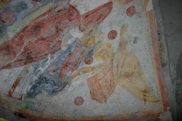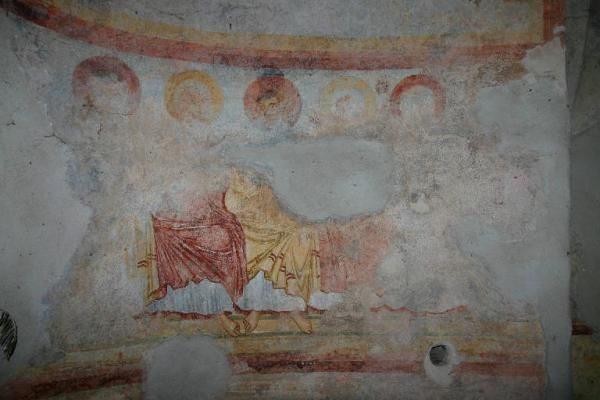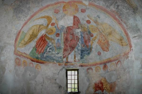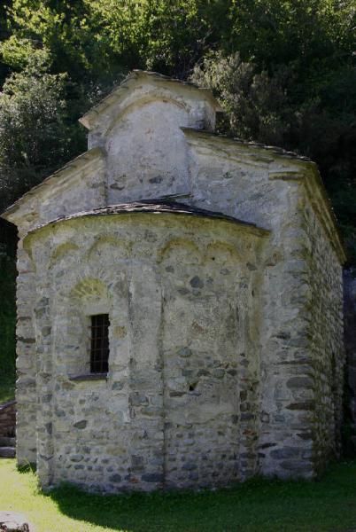 Sopra l'abside svetta un fastigio con un arco cieco inserito in un timpano nel quale erano visibili fino all'inizio del XX secolo alcune tracce di decorazioni pittoriche oggi scomparse. Sui lati nord e sud si aprono due porte centinate che consentono l'accesso al vano a base quadrata, coperto da una volta a crociera, nel quale si innesta l'abside. L'interno conserva parte della decorazione pittorica che probabilmente ricopriva tutte le pareti. Lungo le pareti del vano quadrato restano solo alcuni lacerti con figure di Santi quasi illeggibili mentre nel catino dell'abside è possibile ammirare un affresco con Cristo Pantrocratore fra due angeli e nella parte inferiore un affresco con i dodici Apostoli, divisi in due gruppi di sei dalla monofora posta al centro dell'abside.