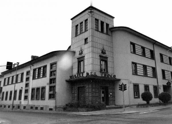 La Caserma ha pianta ad elle; sull'angolo tra i due corpi dell'edificio si eleva una torretta.