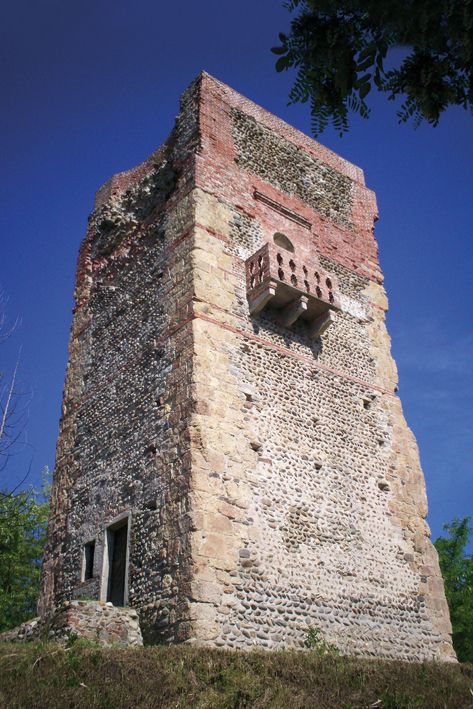 Abbandoniamo la strada asfaltata e incamminiamoci sul bel sentiero acciottolato che ci conduce in cima alla collina (10-15 min.). Varie componenti fanno sì che questo luogo sia suggestivo, quasi magico: la torre, la chiesetta, i ruderi del castello e, non ultimo, lo splendido panorama che si ammira dal piccolo sagrato o dall’estrema punta nord della collina.