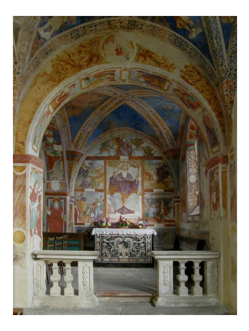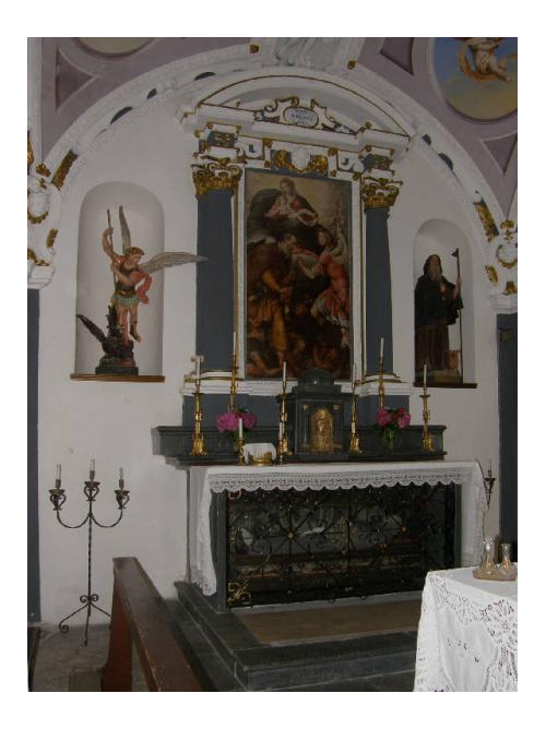 L'altare conserva un paliotto in scagliola risalente al XVIII secolo. La decorazione pittorica rinascimentale è completata dai sottarchi dove sono inserite le figure degli Apostoli e dei Dottori della Chiesa. Ad una fase successiva è invece riconducibile la decorazione del presbiterio caratterizzato da stucchi eseguiti nel XVII secolo. All'altare è esposta una copia della tela di Giovan Mauro Della Rovere, detto il Fiammenghino, che raffigura la Madonna col Bambino tra l'Arcangelo Michele e il beato Miro. Sulla volta del presbiterio sono presenti decorazioni pittoriche eseguite nel XIX secolo dal pittore Luigi Tagliaferri.