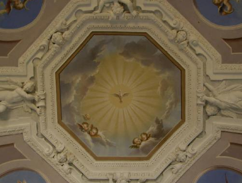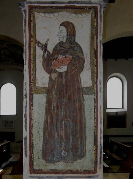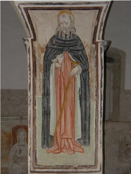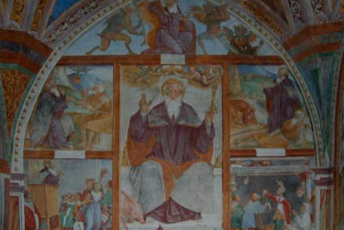 Sugli arconi e sui pilastri sono presenti figure di Santi e Profeti, fra cui si riconoscono S. Giorgio, S. Maria Maddalena, S. Marta, S. Sebastiano, S. Giovanni Battista, S. Martino, S. Orsola e S. Rocco. Nella volta della campata invece sono visibili Dio Padre, S. Miro, S. Michele, cui era dedicata la chiesa originaria, S. Vincenzo e S. Stefano. Infine nella cappella absidale sono raffigurate le Storie di S. Antonio composte da cinque episodi: le Tentazioni, l'Incontro con S. Paolo Eremita, la Morte di S. Paolo, La Guarigione di un'indemoniata, i Miracoli presso la tomba di S. Antonio, e sulle pareti laterali le figure di S. Bernardo e S. Stefano.