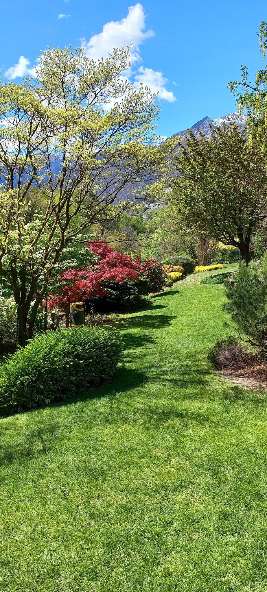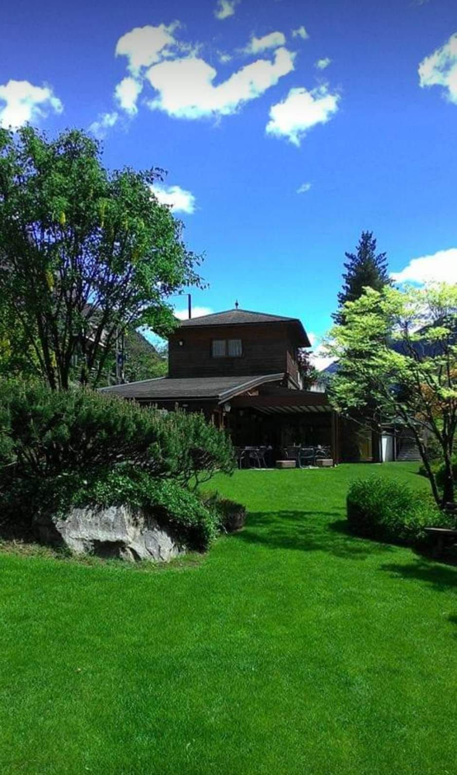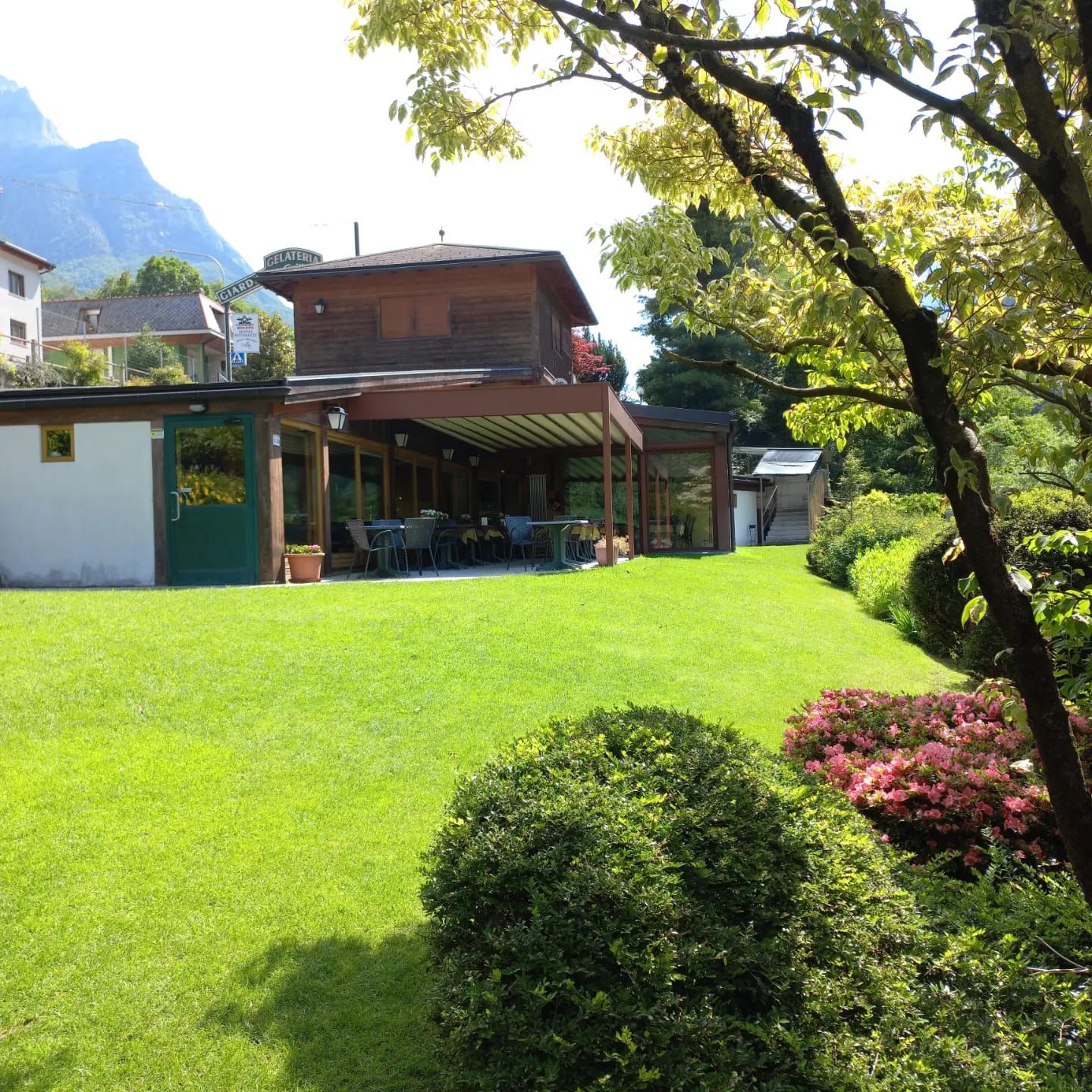 Una costruzione tutta in legno d'abete, caldo e profumato, ospita la Pizzaria-Grill dell'Hotel Aurora. Immersa in un giardino verdissimo che il fiume Mera costeggia, senza farsi vedere.