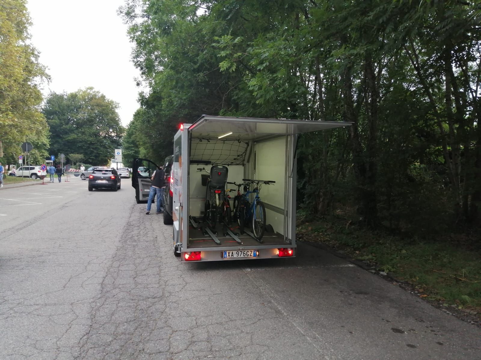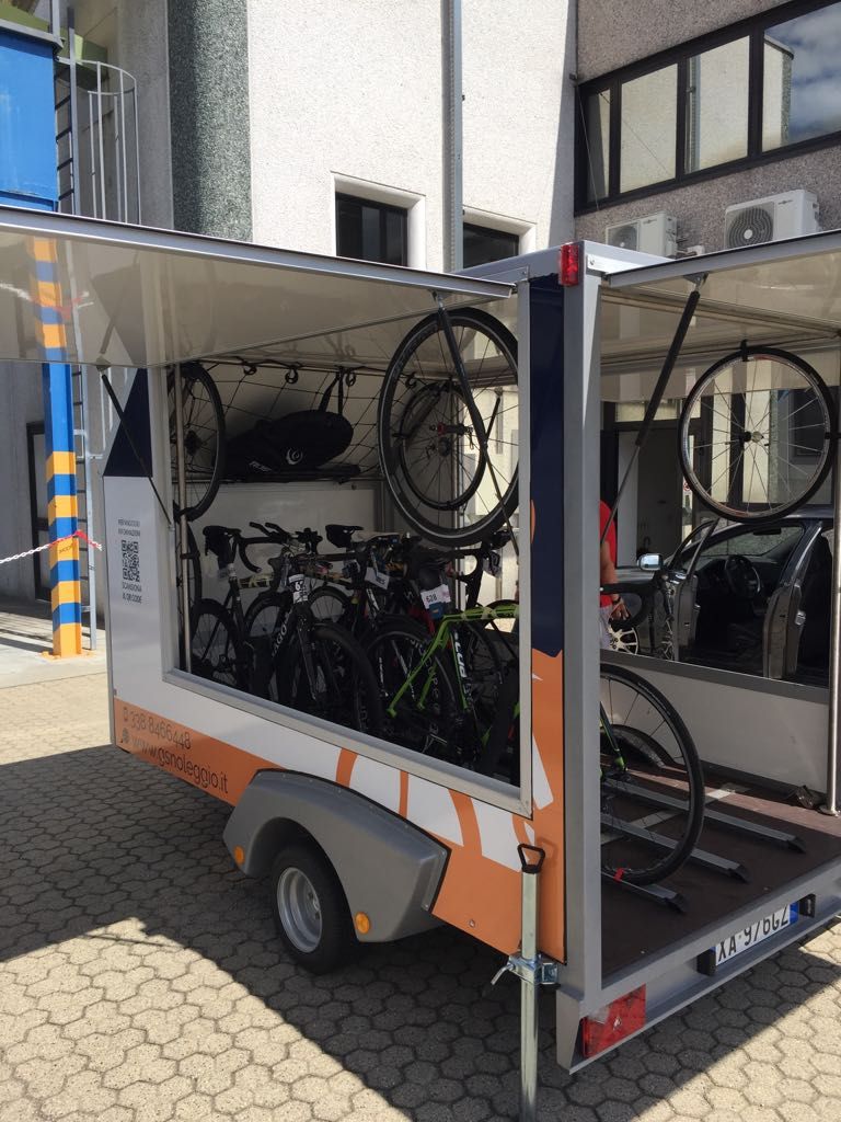 Ho attrezzato i miei pulmini per il traino di carrelli adibiti al trasporto di biciclette, ogni bici ha il suo stallo vengono legate e assicurate durante il trasporto onde evitare qualsiasi tipo di urto, senza la necessità di smontarle.