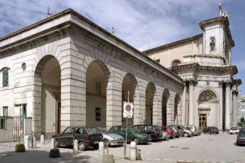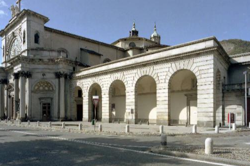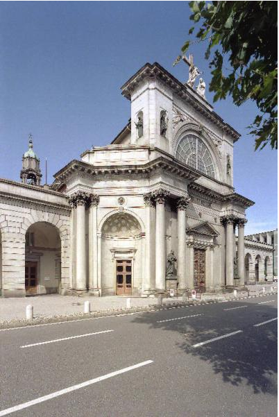 La chiesa, ubicata nei pressi delle mura cittadine, è il frutto di diversi interventi realizzati dal XVI al XIX secolo che hanno lasciato numerose opere d'arte. La facciata, rivolta ad est, ha un aspetto imponente e comprende due pareti inclinate in cui sono inserite le porte laterali. Sui fianchi due ali porticate con paramento in finto bugnato contribuiscono all'effetto monumentale del complesso. Il registro inferiore del prospetto è caratterizzato da colonne e paraste giganti di ordine corinzio che inquadrano il portale centrale con timpano sommitale e due statue bronzee con le figure di S. Paolo e S. Pietro, opera di Giuseppe Siccardi.