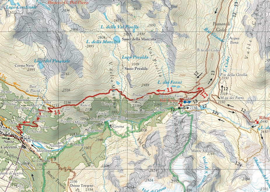 L'itinerario parte dal Rifugio dei Forni. Ecco i luoghi attraversati: Baite dei Forni - Baite Pradaccio - Baite Rasei - Baite dell’Ables - Ceisa di Sotto - Santa Caterina