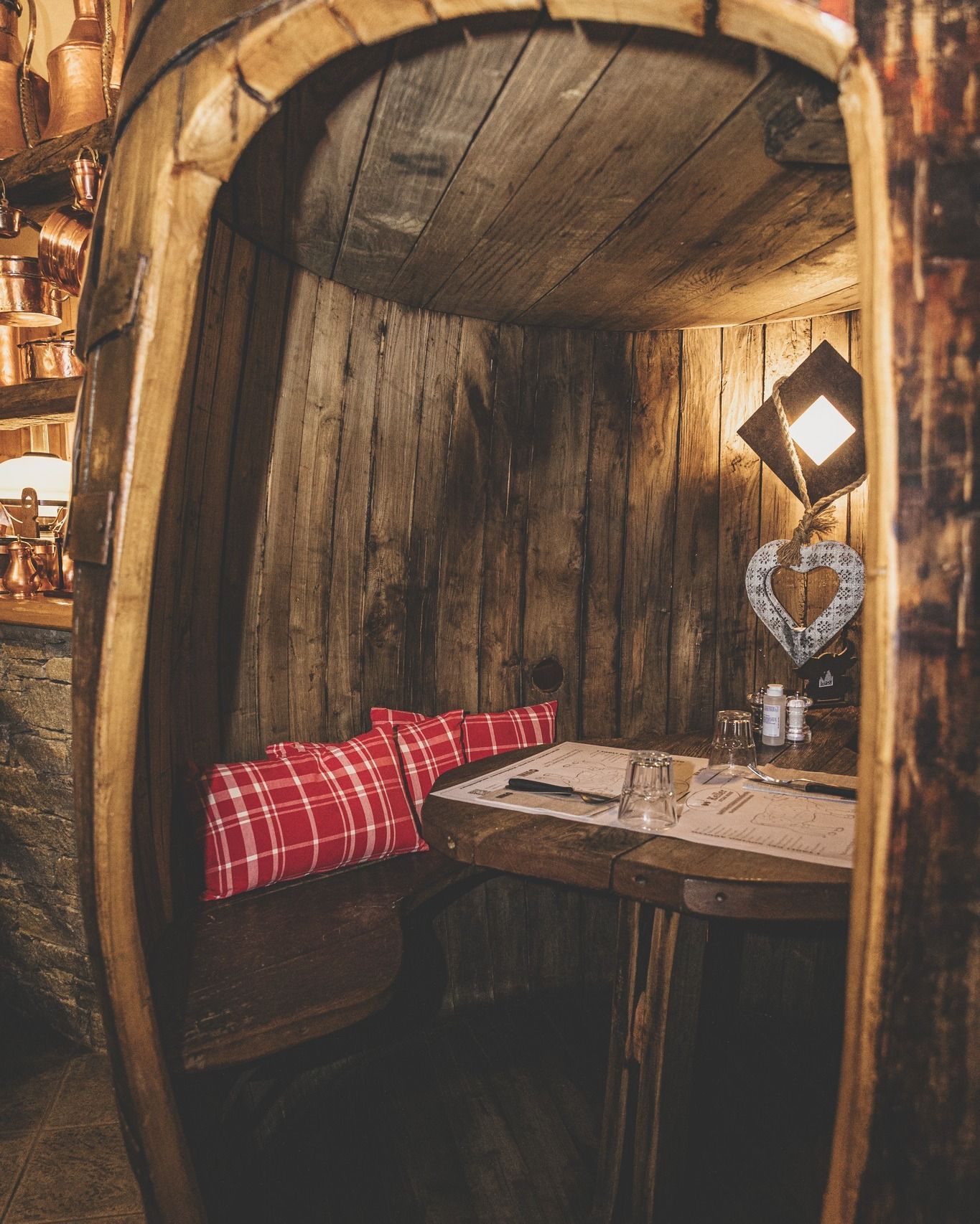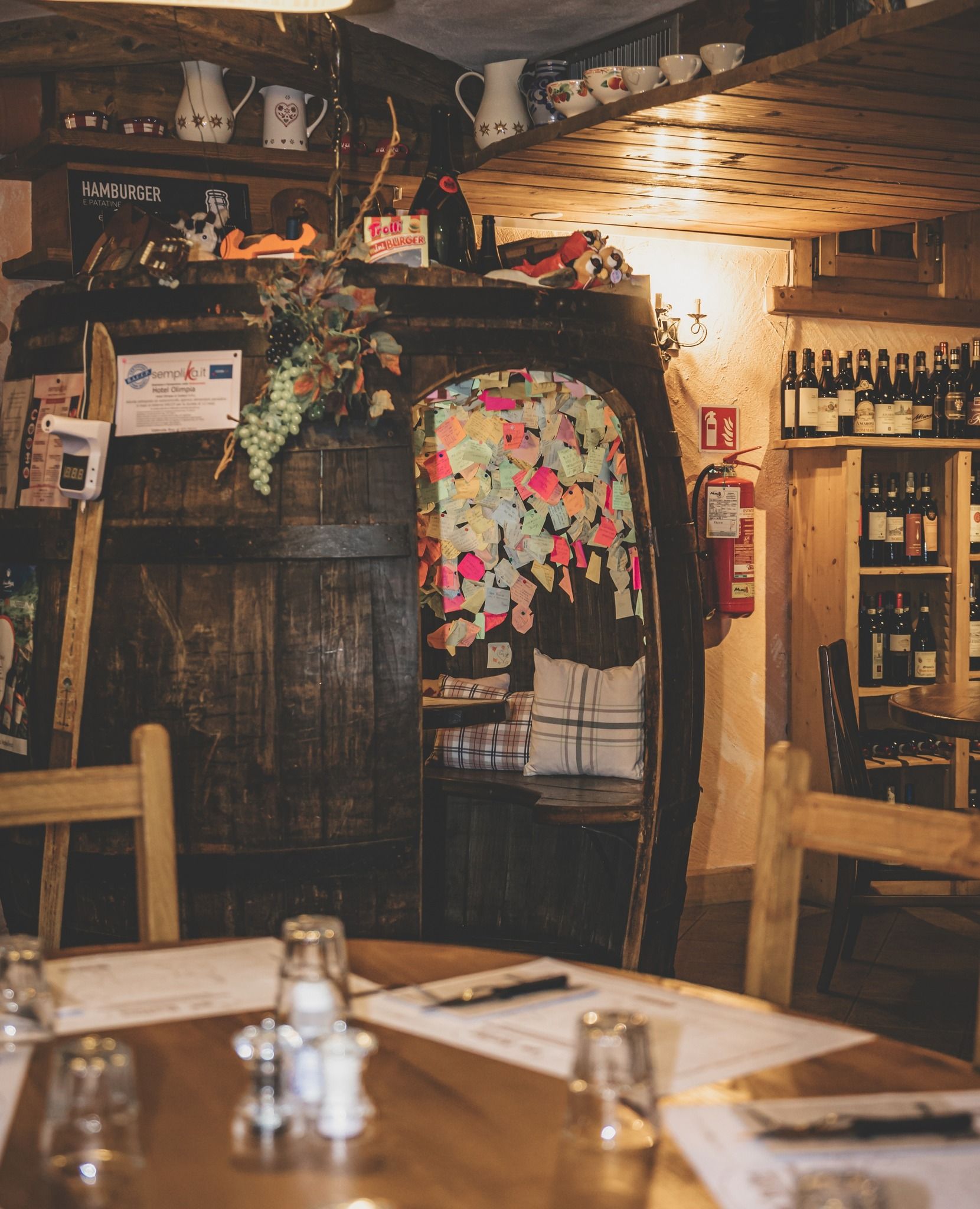 Cucina a vista con griglia a carbone, cantina tipica, botte dove cenare e un ambiente famigliare ed informale sono gli elementi distintivi.