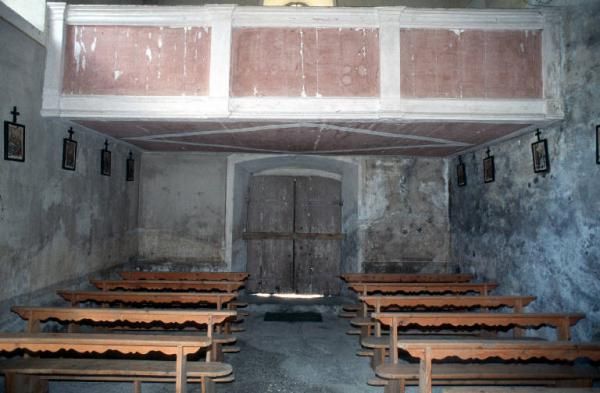 L'impianto planimetrico è dei più semplici, ad aula unica e abside quadrangolare, con piccola sagrestia sormontata da una stanza che fungeva da sede per il Monte di pietà. Una scala esterna consente di raggiungere la loggia in controfacciata, elemento ricorrente nelle chiesette della zona. Entrando, lo sguardo è catturato dai vivaci affreschi dell'abside, eseguiti nel 1546 dall'ormai anziano Vincenzo de Barberis, pittore di Brescia operoso tra Milano e la Valtellina, noto soprattutto per aver eseguito, anni prima, vaste decorazioni a soggetto profano nella dimora rinascimentale più importante della Valtellina, palazzo Besta di Teglio.