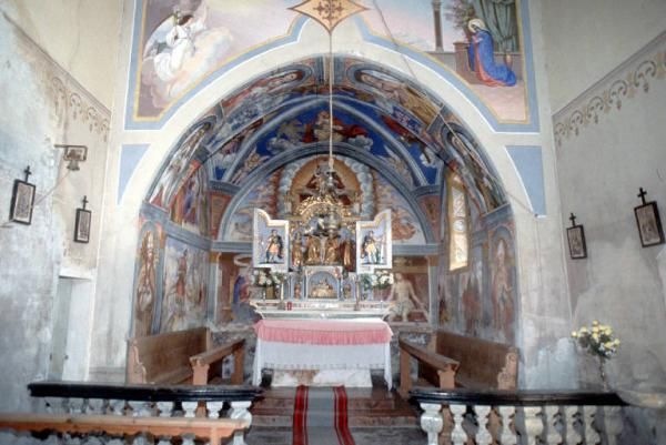 Sopra la mensa d'altare è appoggiata un'ancona in legno dipinto e dorato, che il restauro ha liberato da pesanti e mortificanti ridipinture. Rientra nel tipo a sportelli, essendo dotata di ante che venivano aperte solo in occasione delle celebrazioni, e malgrado la struttura a scrigno e certi tratti richiamino i modi delle fiorenti botteghe tirolesi, la si pensa uscita da una bottega operosa in Valtellina a fine Cinquecento.